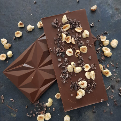 Close-up of various chocolate types on rustic plates, showcasing texture and indulgence.